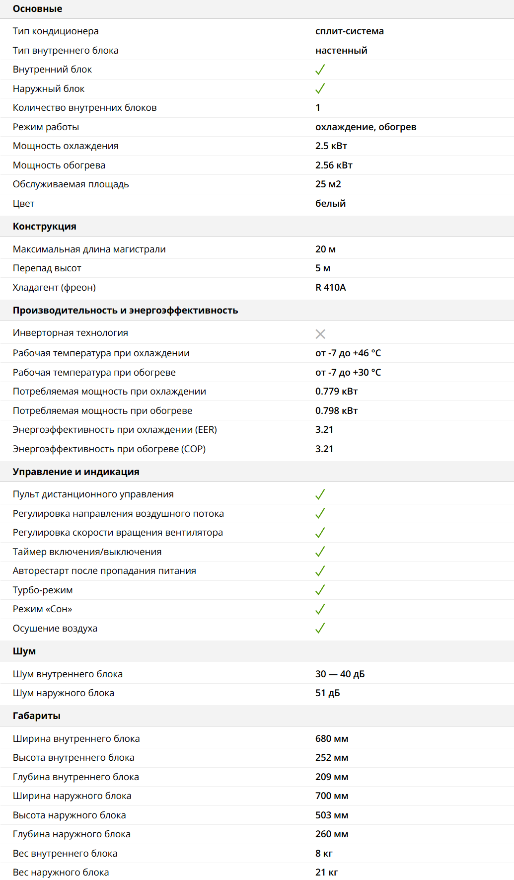 ✅ Энергоэффективность при охлаждении (EER) и обогреве (COP) составляет 3.21, что делает этот кондиционер экономичным в использовании.